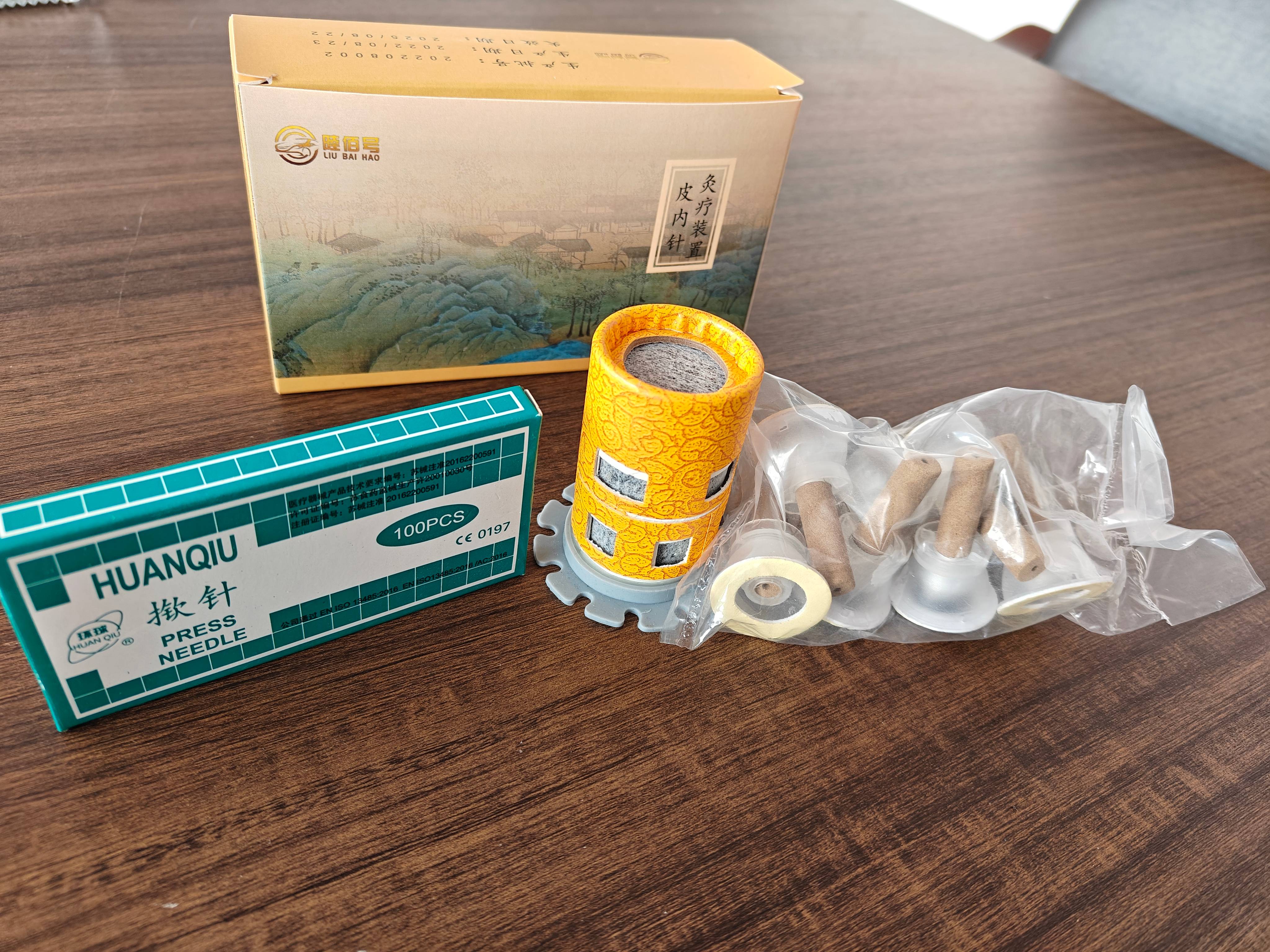 三个特点,我们的艾柱是中空的,点着之后艾烟会往下熏烤人体的皮肤,,艾柱下面配有揿针,可以长时间刺激人体穴位,同时可以做温针治疗。